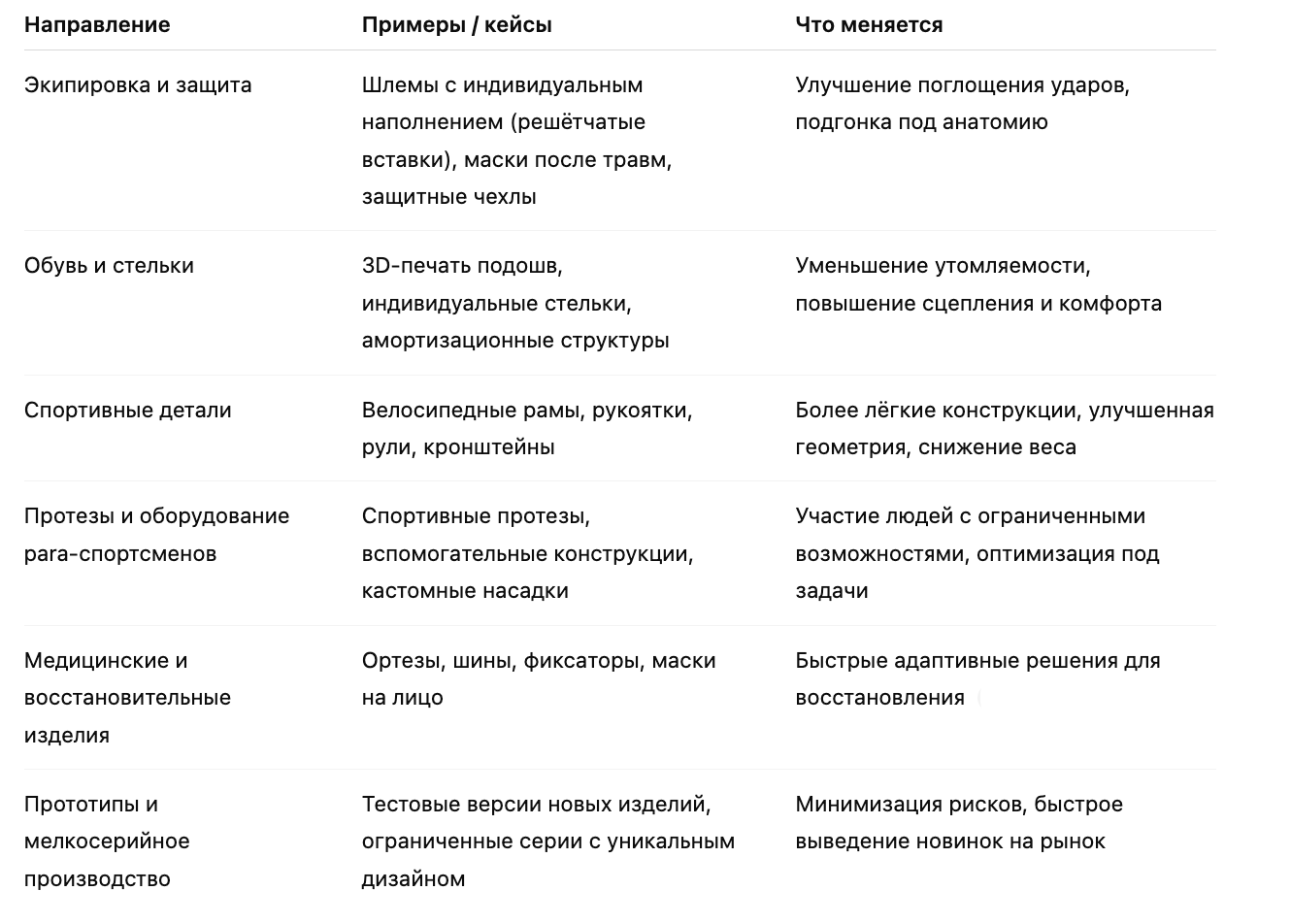 - 3D-печать для para-спортсменов и протезов. Позволяет создавать более дешёвые, лёгкие и адаптированные протезы, давая спортсменам новые возможности.