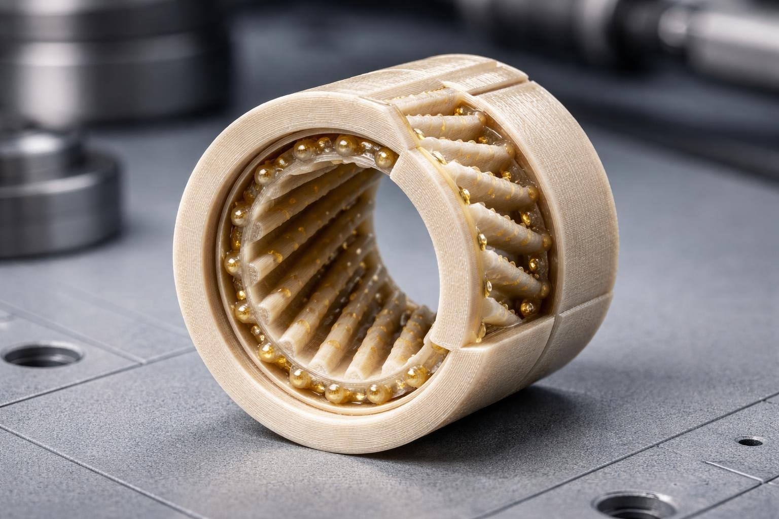 Это подшипники скольжения, напечатанные из материалов с низким трением или наполнителями (PTFE, графит, специальные инженерные пластики). Смазка может быть дополнительной, но часто достаточно “сухого” скольжения. Такие самосмазывающиеся подшипники особенно хороши там, где обычная смазка загрязняет изделие.